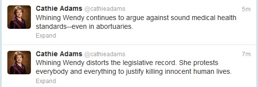 State Sen. Wendy Davis, D-Fort Worth, just began her filibuster to stop legislation that intrudes on the private medical decisions women make in consultation with their own doctors. And Texas Eagle Forum President Cathie Adams can’t resist responding with nasty insults on her Twitter account. Adams has already called the senator “whining Wendy” twice and claims Sen. Davis seeks to “justify killing innocent human lives.”